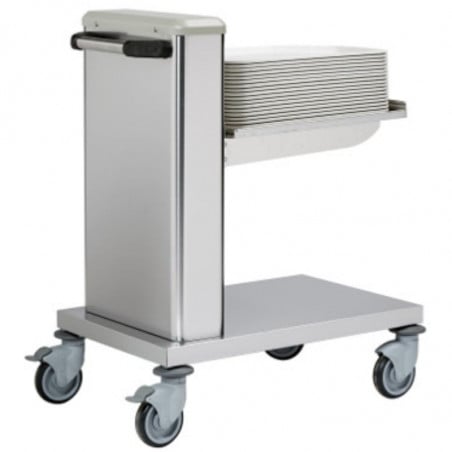 Entièrement conçu en acier inoxydable, ce Chariot pour plateaux-repas peut supporter jusqu'à 120 kg de charge. À partir de 65 kg, le plateau support est en butée sur la structure inférieure.