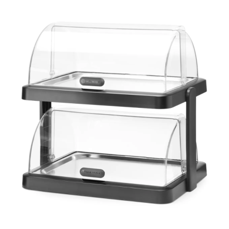 La Vitrine Buffet à Couvercle Coulissant UNIQ - 2 Plateaux - Noir se distingue par sa praticité et son design moderne. Avec ses dimensions compactes (358x458x475 mm) et son poids de 5,9 kg, cette vitrine est idéale pour les espaces restreints. Constituée de plastique ABS robuste et de deux plateaux en acier inoxydable, elle garantit durabilité et facilité de nettoyage. Le couvercle transparent en PET s’ouvre à 90° pour un accès facile, tandis que les blocs réfrigérants intégrés maintiennent vos aliments à température optimale, assurant ainsi leur fraîcheur. Parfait pour une présentation élégante de vos produits.