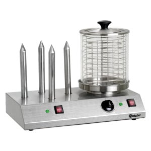 Avec ses 4 plots chauffés pour le pain et son cylindre en verre de 200 mm cette machine à Hot-Dog est tout ce qu’il vous faut pour faire des Hot-Dogs ! Ajoutez de l'eau dans un cylindre de 1,5 litre, ajoutez vos saucisses et quelques minutes plus tard, servez de délicieux Hot-Dog maison.