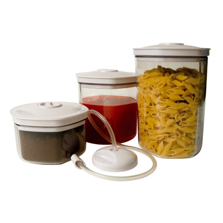 Ce kit est composé d'un tuyau d'aspiration pour l'utilisation des machines sous vide externes, et de 3 conteneurs transparents, avec couvercles, de capacité différentes: 25 cl, 500 cl et 750 cl.