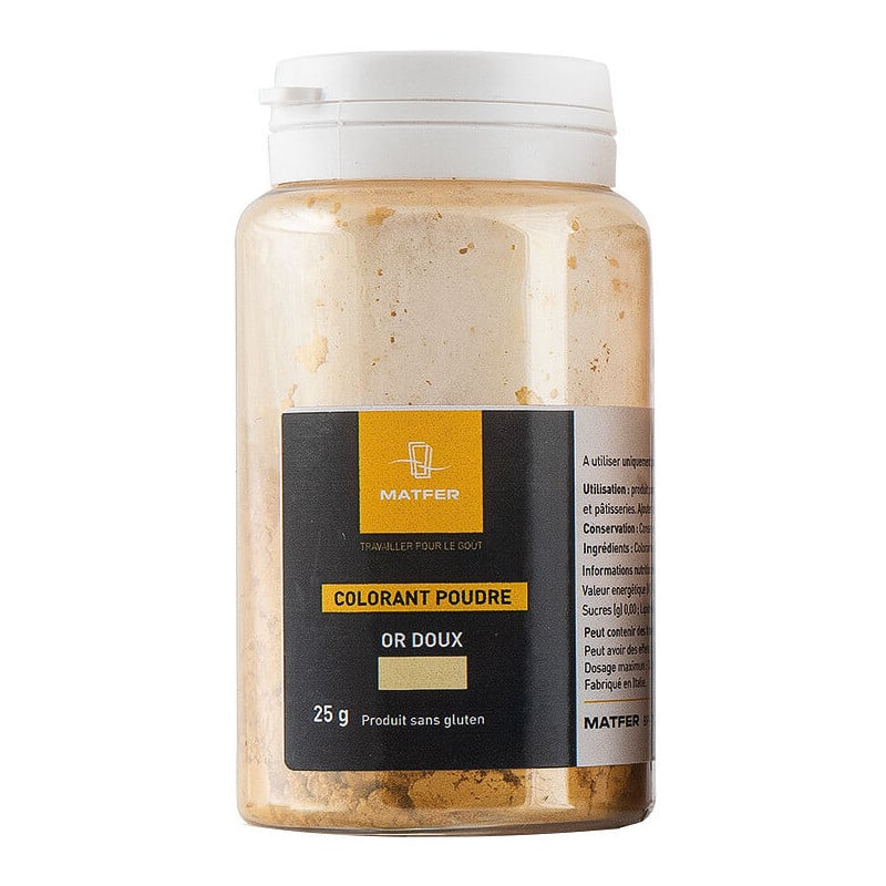 Colorant Poudre Dispersable - Or Clair - 25 g Matfer Ref. MR410229 Prix 16 €58 HT 17 €49 TTC Ajouter au panier