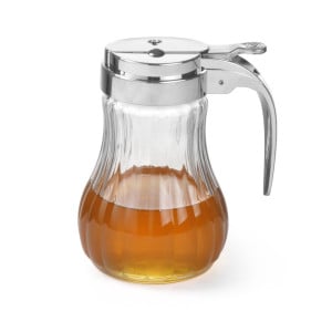 Ce Verseur À Miel permet d'arroser vos pancakes, desserts et tartines de sirops d'érable ou miels liquides de façon précise sans en répandre en dehors du récipient ciblé .