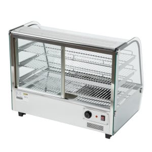 Vitrine à quatre côtés en verre pour maintenir les aliments préparés au chaud. 3 étagères en chrome fixes pour présenter tartes, pâtisseries et autres en-cas. Température réglable de 30 à 90°C, façade en verre incurvée pour présenter un maximum de produits et portes arrière coulissantes pour un accès facile. Possède un éclairage interne à LED.