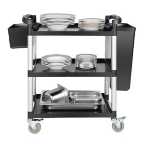 Ces Chariots de service en polypropylène de structure solide offrent une grande solidité pour de nombreuses applications dans les hôtels, les restaurants, les hôpitaux etc.... La poubelle et le bac à couverts encliquetables sont vendus séparément. Utilisation sur surfaces planes.
