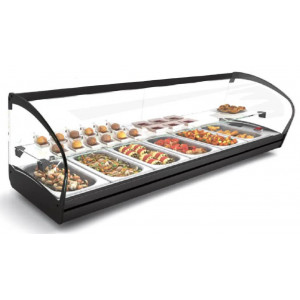Cette Vitrine chauffante élégante et compacte est dotée d'une vitre avant incurvée. La porte arrière à charnière permet de mettre facilement en place vos tourtes, quiches, tartes, pizzas et autres spécialités chaudes.