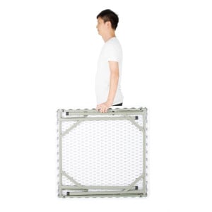 La table carrée pliante Bolero est robuste et facile à entretenir, fabriquée à partir de polyéthylène haute densité et de pieds en métal résistants. Cette table pratique et robuste convient à une utilisation intérieure et extérieure.Puis-je l'utiliser à l'extérieur ?Oui - elle est fabriquée à partir de PEHD, un plastique extrêmement résistant aux intempéries et d'acier résistant à la rouille, ce qui la rend idéale pour les réceptions en plein air, les stands alimentaires et plus encore. Pour la conserver en parfait état plus longtemps, nous vous recommandons toutefois de la stocker à l'intérieur afin d'éviter toute usure prématurée.Est-elle facile à transporter ?Oui, les pieds pliables sont conçus pour se rabattre parfaitement sous le plateau de la table, ce qui la rend suffisamment compacte pour être facilement transportée. Egalement légère, elle ne pèse que 12 kg. Combien de personnes peut-on asseoir autour ?Elle peut accueillir confortablement quatre personnes. À associer aux chaises pliantes Bolero pour un ensemble aussi pratique que durable.