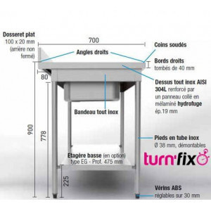 Livrée avec bonde et tube surverse. Montage facile par emboîtement des pieds dans les bandeaux inox - système breveté.