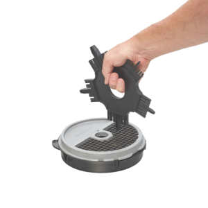 Il dispose d’un couvercle amovible avec deux goulottes : une large pour les légumes volumineux et une cylindrique (Ø 6,9 cm) avec insert de maintien pour une coupe uniforme des légumes longs ou fragiles. Compatible avec 53 disques, il permet de varier facilement les préparations (macédoines, frites, brunoises, gaufrettes…).