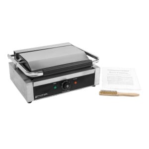Ce Grill Panini à Plaques Lisses est idéal pour les professionnels de la restauration. Sa plage de température est réglable, à l'aide d'un thermostat, de 50°C à 300°C. La structure est conçue en acier inoxydable et les plaques sont émaillées. La puissance de cet appareil est de 2200 W.