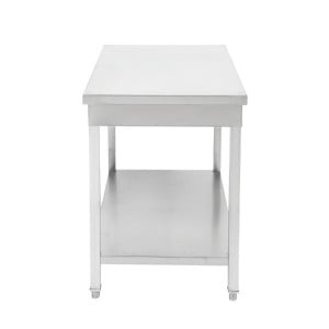De plus, ce modèle est équipé d’une étagère basse robuste, augmentant considérablement l'espace de stockage disponible. Ce détail est crucial pour maintenir l'ordre et la propreté dans la zone de travail, permettant de stocker les ustensiles et les ingrédients de manière organisée et accessible. L’absence de dosseret offre une flexibilité accrue, permettant de positionner la table au centre de la cuisine ou contre un mur selon les besoins.