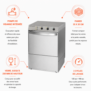 Ce Lave-Verre Professionnel avec Doseur de Liquide de Rinçage et Détergent et Pompe de Vidange est idéal pour les professionnels de la restauration. Il convient parfaitement pour le lavage de la verrerie, des couverts et des petites assiettes. Adapté pour des paniers de lavage de dimensions 35 x 35 cm, il possède 3 bras et 2 cycles de 120 et 180 secondes.