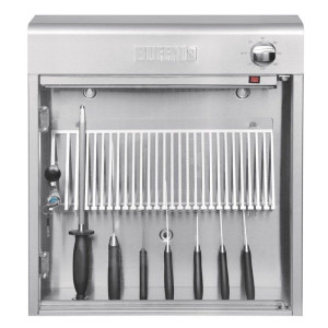 La sécurité est également au cœur de la conception de ce produit. L'armoire comporte une porte verrouillable, permettant de sécuriser les couteaux à l’intérieur. Le matériel est équipé d'une minuterie réglable, qui offre la flexibilité de choisir la durée de stérilisation nécessaire selon le degré de désinfection désiré. De plus, une fonction spéciale empêche les lumières UV de rester actives lorsque la porte est ouverte, réduisant ainsi le gaspillage d'énergie tout en augmentant la sécurité pour les utilisateurs.