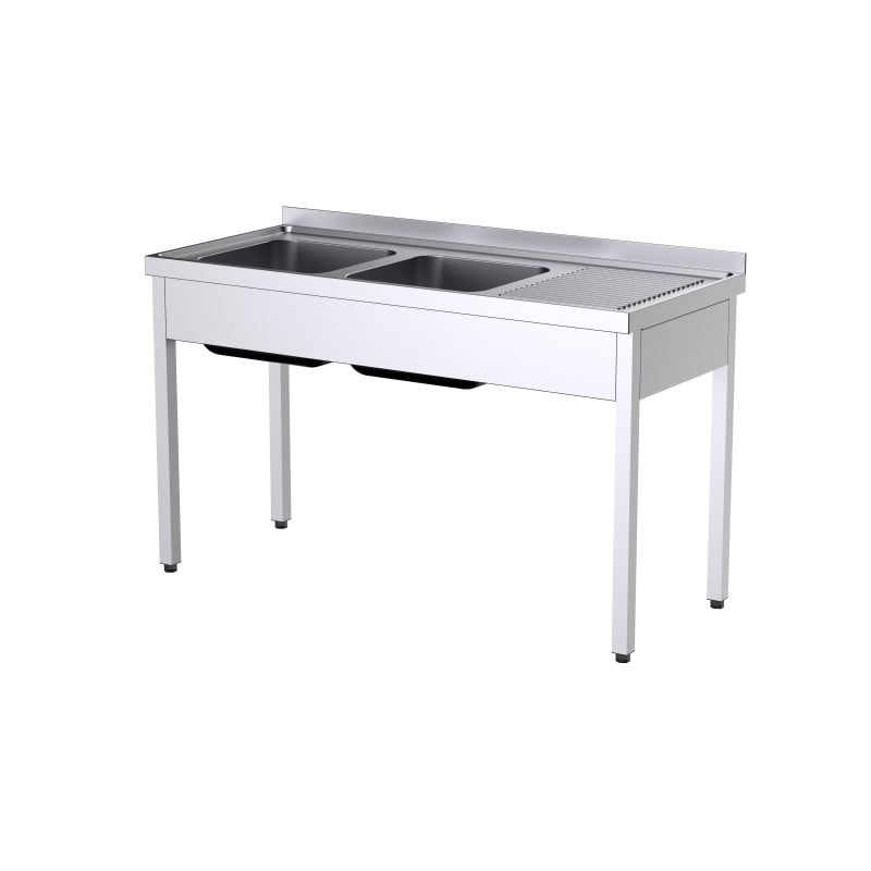 Prix réduit Plonge 2 Bacs avec Etagère et Egouttoir à Gauche - L 1350 x P 500 mm Distform Ref. DMFSI15135 -7% Prix Prix de base 628,33 € HT 580 € HT 696 € TTC Ajouter au panier