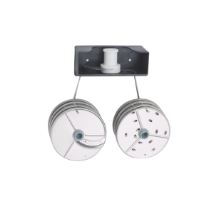 Le combiné cutter et coupe-légumes R 401 est fourni avec une cuve cutter de 4,5 litres et un ensemble de quatre disques (éminceur 2 mm, 4 mm, râpeur 2 mm, julienne 2x2 mm) ainsi qu'un support mural pour une organisation optimale.