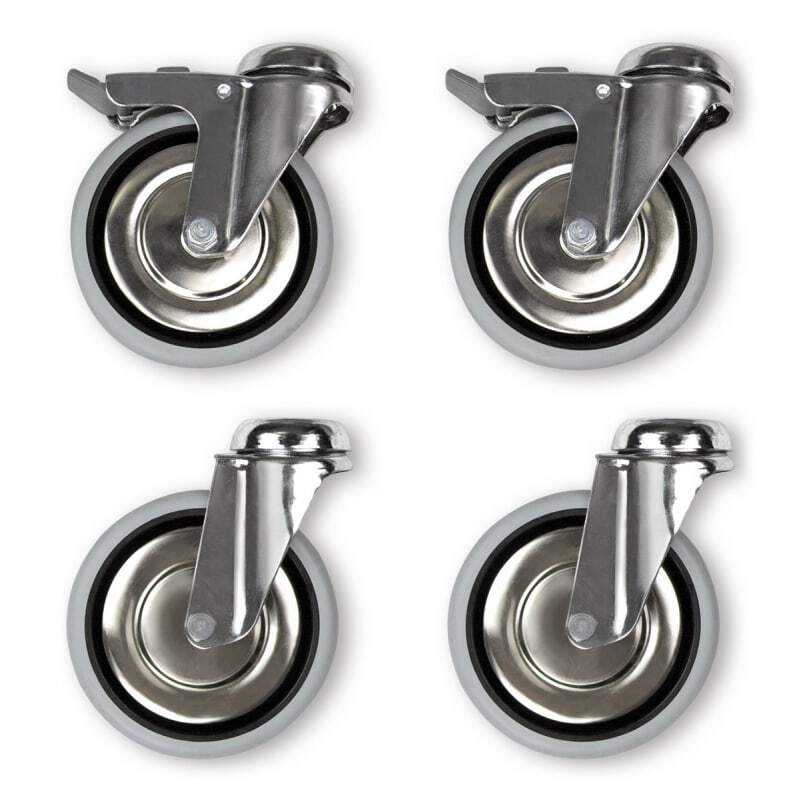 Ce Lot de 4 Roues est spécialement conçu pour les Tables Inox et Plonges de la marque Dynasteel. Il comprend deux roues avec freins et deux roues sans.