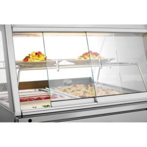 Dotée d'une capacité de 95 litres et ajustable pour accueillir des bacs GN 1/1, cette vitrine offre une flexibilité exceptionnelle. Elle permet ainsi d'exposer divers types de plats, des entrées chaudes aux accompagnements. La plage de température, réglable de 30 à 110 °C via un thermostat intégré, garantit une conservation optimale des aliments à la température désirée, tout en respectant les normes de sécurité alimentaire.