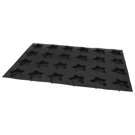 Moule à Etoiles - 24 Empreintes - 80 x 65 mm, doté d'une conception en tricot de verre recouvert de plusieurs couches de silicone. Cela offre une souplesse, un maintien et une anti-adhérence exceptionnels pour un démoulage facile sans graissage préalable. Compatible avec tous types de fours et offrant une cuisson homogène, il est également facile à nettoyer.