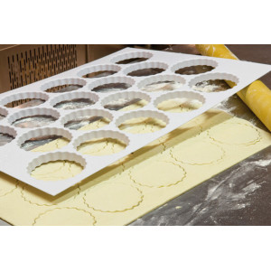 Plaque de Découpoirs Ronds Cannelés - 72 Empreintes - ⌀ 45 mm, fabriqué en abs. Idéal pour réaliser facilement et rapidement des découpes de pâte pour sablés, biscuits et fonds de petits fours. Gain de temps assuré grâce à la possibilité de découper directement sur les plaques à four.
