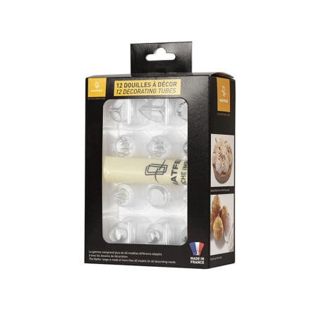 Cet ensemble comprend une variété de douilles, dont cinq douilles unies (U2, U6, U8, U10 et U12), cinq douilles cannelées (A8, B8, C8, E4 et F8), une douille feuille FE2 et une douille bûche à 8 dents. Ce large éventail de douilles permet de réaliser une multitude de décorations, que ce soit pour des pâtisseries, des plats salés ou même des cocktails.