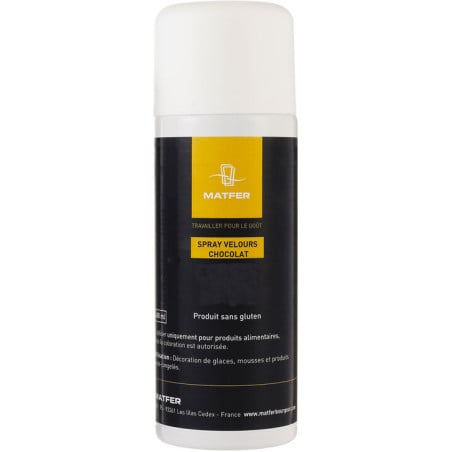 Le Spray Colorant Velours Chocolat - Choco Lait - 400 ml de Matfer est une solution idéale pour donner une finition parfaite à vos desserts. Il s'agit d'un accessoire de première qualité qui dépose une fine couche d'aspect velours sur vos entremets congelés. Ceci permet d'apporter une touche visuelle attractive et gourmande à vos créations culinaires.