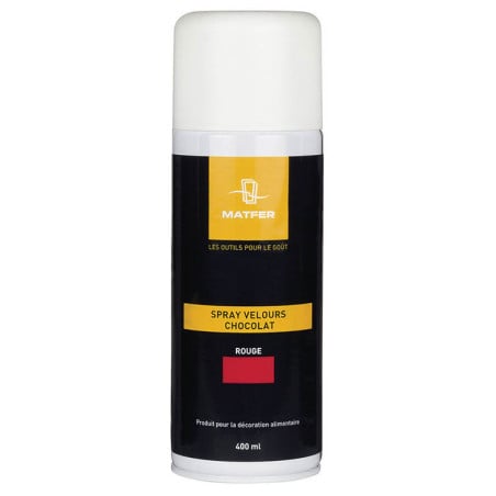 Le Spray Colorant Velours Chocolat - Rouge - 400 ml de Matfer est un outil indispensable pour les professionnels de la pâtisserie. Sa formulation à base de beurre de cacao donne un aspect velours unique, qui rehausse visuellement vos desserts et gâteaux.