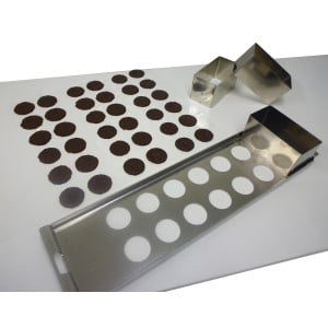 Le kit est composé d'une plaque perforée et d'un réservoir/sabot pour le chocolat. Ces composants sont entièrement en acier inoxydable, assurant une durabilité et une résistance aux températures élevées. La taille des tuiles, d'un diamètre de 50 mm et une profondeur de 3 mm, est parfaite pour créer des tuiles de chocolat d'une consistance idéale.