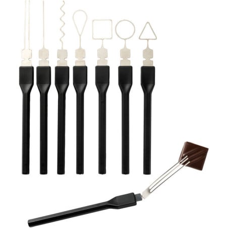 Un des atouts majeurs de cet ustensile est sa capacité à créer huit modèles de décor différents : 1 dent, 2 dents, 3 dents, rond, carré, triangle, goutte et zig zag. Ces variations permettent aux artisans chocolatiers de laisser libre cours à leur créativité, ajoutant une touche unique à chaque bonbon.