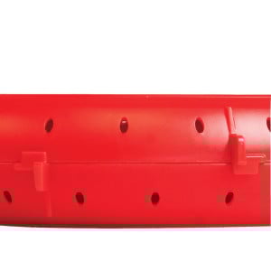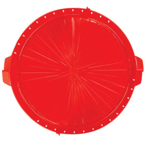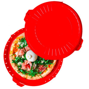 Boîte Ronde Réutilisable - Ø 330 mm - Rouge - Lot de 10. Lot de dix boîtes rondes en PEHD, idéal pour le stockage et le transport de pizzas et pâtisseries, à la fois légères et robustes, résistantes aux chocs et à l'usure. Empilables avec des ergots sur le couvercle, elles offrent un encombrement minimal. Dotées d’aérations pour éviter la condensation, ces boîtes sont 100 % recyclables, aptes au contact alimentaire et utilisables de -40 °C à +90 °C. Faciles à nettoyer, elles sont également compatibles lave-vaisselle.