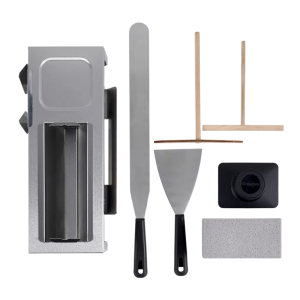 La propreté est également un élément central de ce kit. Les encoches sur les rebords du bac à eau permettent de retirer facilement le surplus de pâte, maintenant ainsi la zone de travail propre et ordonnée. Compact et innovant, ce kit devient un outil indispensable pour tout professionnel visant l'excellence dans la préparation des crêpes.