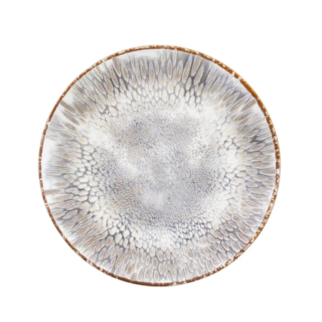 La collection Braise se distingue par son émail réactif brillant qui mime avec délicatesse l'aspect de la peau d’un reptile. Ce choix de design n’est pas seulement visuel mais s’inscrit dans une démarche de création d’une ambiance unique pour les convives. La texture reptilienne, combinée à la rondeur classique de l'assiette, crée un contraste saisissant qui attire le regard et valorise la présentation des desserts.