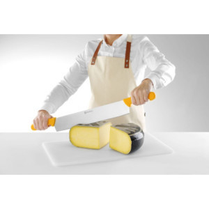 Les poignées ergonomiques en polypropylène assurent une prise en main confortable et sécurisée, réduisant ainsi la fatigue de l'utilisateur lors de longs services en cuisine. Le design à double manche permet une utilisation plus flexible, offrant une meilleure maîtrise et un meilleur contrôle lors de la coupe de fromages de différentes textures et tailles.