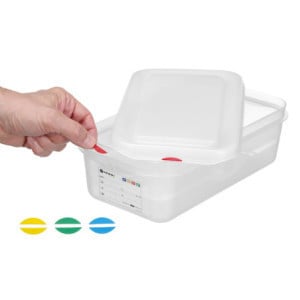 Le bac est également conçu pour faciliter votre organisation. Il est muni de clips de couleur (vert, jaune, bleu et rouge) conformes aux directives HACCP. Ainsi, vous pouvez identifier rapidement et efficacement vos contenus, assurant un service rapide et sans accrocs. De plus, le bac est doté d'une étiquette intégrée, utilisable avec des marqueurs effaçables. Cela facilite le suivi de vos stocks et la rotation des produits.