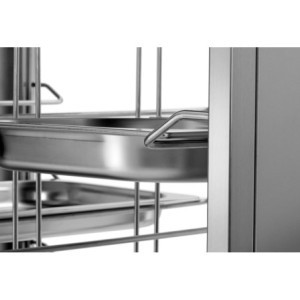 Ce chariot à plateaux se distingue par sa capacité à accueillir jusqu'à 20 niveaux de récipients GN 1/1, plaques et grilles. Chaque niveau peut supporter une charge maximale de 10 Kg, assurant ainsi une stabilité sans faille lors du transport des aliments. Les tiroirs abaissés empêchent tout risque de glissement, garantissant ainsi une sécurité optimale lors de son utilisation.