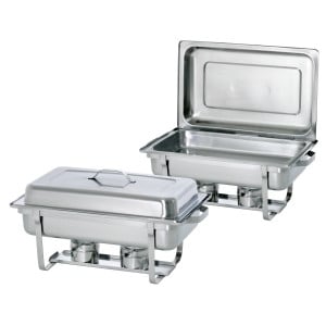 Ces types de chafing dish se composent de deux suppports pour boites de fuel ainsi qu'un crochet pour couvercle d'un côté. Ils sont livrés avec un bac GN1/1 chacun.