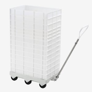 Pour ceux qui exigent encore plus de flexibilité, le socle est compatible avec le timon amovible GILAC, disponible en option, qui simplifie le déplacement de configurations multiples de bacs et caisses standards (600 x 400 et 400 x 300 mm). Cette compatibilité assure une intégration parfaite avec les équipements GILAC existants, renforçant ainsi l'efficacité des processus logistiques.