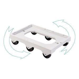 Le socle bénéficie d'une conception exclusive avec six roues fixes, dont deux roues centrales décalées. Cette caractéristique unique permet de franchir aisément les seuils et les obstacles, minimisant l'effort physique nécessaire et augmentant la sécurité lors des déplacements de charges lourdes. Le pivotement sur les roues centrales augmente la manœuvrabilité, permettant de tourner avec souplesse même dans les espaces les plus restreints.