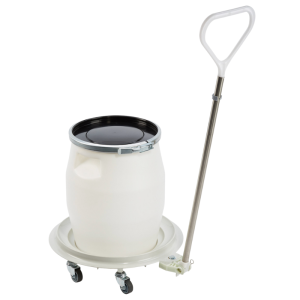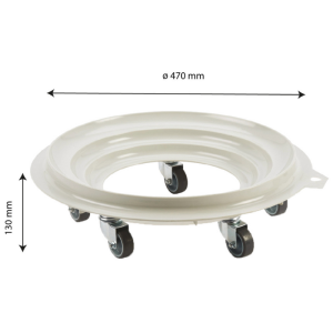 Ce socle est spécialement conçu pour offrir une excellente stabilité et une manœuvrabilité exceptionnelle, caractéristiques renforcées par la présence de cinq roues directrices montées sur roulement à billes. Le diamètre de 50 mm des roues, associé à un bandage en caoutchouc, assure un déplacement fluide et silencieux sur les surfaces lisses, supportant une charge maximale de 120 kg. Cette capacité de charge le rend idéal pour transporter des fûts de 30 L à 100 L ainsi que des conteneurs alimentaires et baquets ronds jusqu’à 75 L.