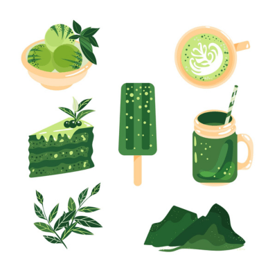 Diverses illustration représentant du matcha : poudre, plante, gâteau, sachet de thé etc.