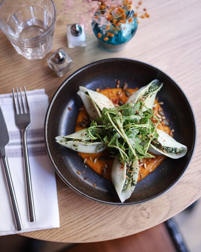 Une fois entrés dans le restaurant, Fanny MIJON, la patronne, nous accueille avec le sourire dans la salle du restaurant. Fanny est elle-même végétalienne et, en tant que cliente de ce type d’établissements, regrette l’absence de « vrais » restaurants végétaliens, où l’on peut s’asseoir, prendre son temps, discuter… Car si de nombreux établissements on ouvert ces dernières années, beaucoup, si ce n’est quasiment tous, sont dédiés au snacking et à la restauration rapide, toute végétalienne soit-elle. Fanny, diplômée d’une école de commerce et ancienne de maisons prestigieuses telles que Chanel, Lancel ou A.P.C. plaque tout pour travailler dans divers bars et snacks vegan afin de se former. Et le résultat est réussi. Car ici, tout évoque la nature : les chaises ont une assise et un dossier en bois, du parquet naturel recouvre le sol, les tables sont en bois… Et encore une fois, ça sent bon la nature et les fruits et légumes de saison. Betteraves rôties à la crème de sésame, conchiglie ricotta et épinards à la crème de potimarron au romarin, tofu laqué… Vous l’aurez compris, ici, le terroir est à l’honneur et sublimé.